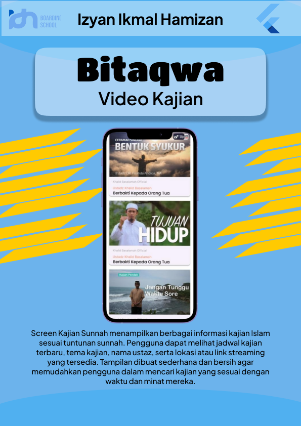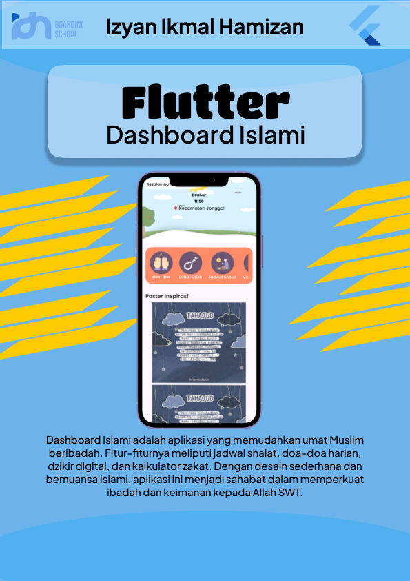 Dashboard Islami adalah aplikasi yang memudahkan umat Muslim beribadah. Fitur-fiturnya meliputi jadwal shalat, doa-doa harian, dzikir digital, dan kalkulator zakat. Dengan desain sederhana dan bernuansa Islami, aplikasi ini menjadi sahabat dalam memperkuat ibadah dan keimanan kepada Allah SWT.