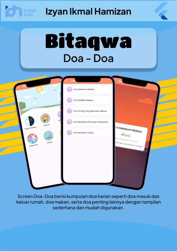 Screen Doa-Doa menampilkan kumpulan doa harian yang dapat membantu pengguna mengingat dan mengamalkan doa dalam setiap aktivitas. Di dalamnya terdapat doa masuk rumah, doa keluar rumah, doa sebelum dan sesudah makan, serta doa-doa penting lainnya. Tampilan yang sederhana dan mudah digunakan memudahkan pengguna untuk belajar dan menghafal doa dengan cepat di mana saja dan kapan saja.