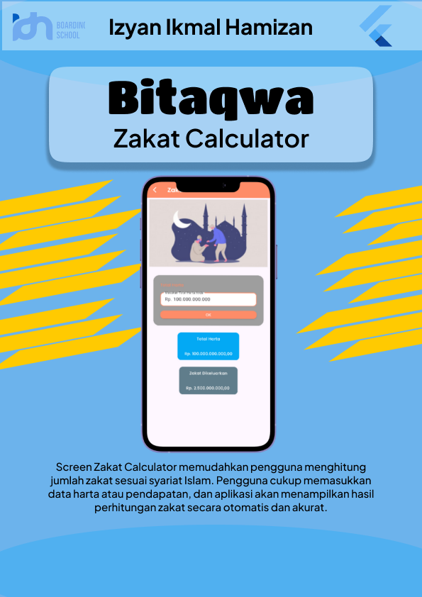 Screen Zakat Calculator menampilkan fitur untuk membantu pengguna menghitung jumlah zakat yang harus dikeluarkan secara mudah dan akurat. Dalam screen ini, pengguna dapat memasukkan data seperti jumlah harta, pendapatan, emas, atau tabungan yang dimiliki. Aplikasi kemudian secara otomatis menghitung besaran zakat berdasarkan nisab dan ketentuan syariat Islam. Tampilan dibuat sederhana dan informatif agar pengguna dapat memahami hasil perhitungannya serta termotivasi untuk menunaikan zakat dengan tepat.