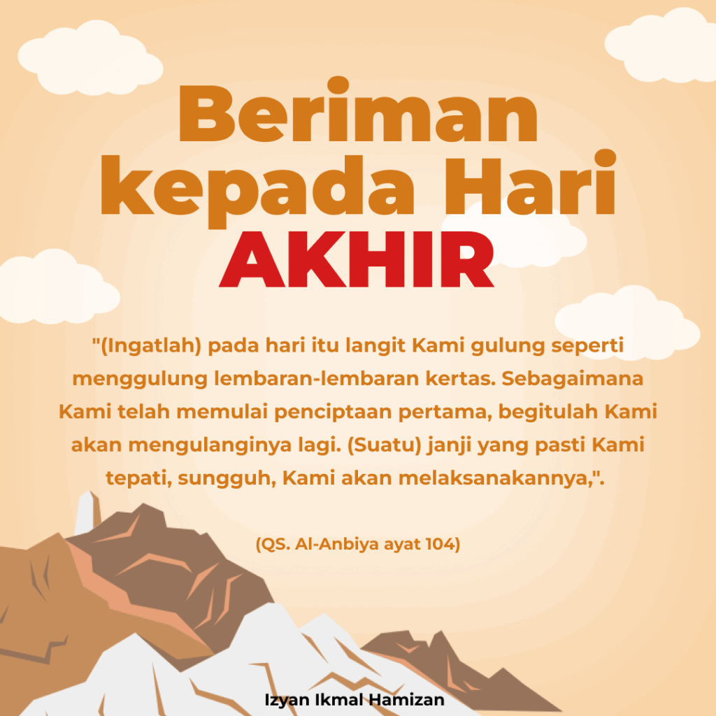 Beriman kepada hari akhir berarti meyakini bahwa kehidupan di dunia bukanlah akhir, melainkan akan ada kebangkitan, hisab, serta balasan surga atau neraka. Keyakinan ini menumbuhkan rasa takut kepada Allah, mendorong berbuat baik, dan menjauhi maksiat. Dengan beriman kepada hari akhir, seorang muslim akan hidup lebih ter arah, sabar menghadapi ujian, dan selalu mengutamakan amal saleh sebagai bekal menuju kehidupan kekal.